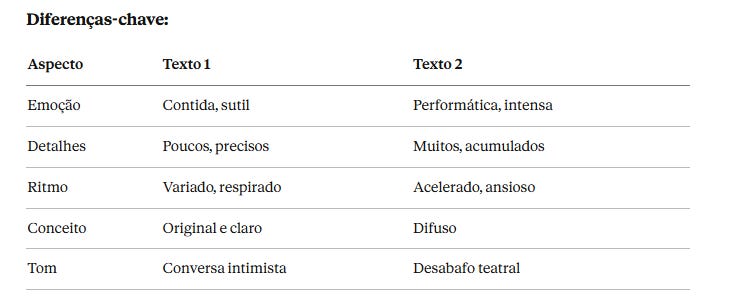 Pedi para comparar o texto que foi gerado com meu texto original, que escrevi com apenas 16 dias pós-parto, cuidando de um recém-nascido às 04h da manhã, e ele identificou o que eu já tinha percebido: era um texto que tentava aparecer mais do que ser.